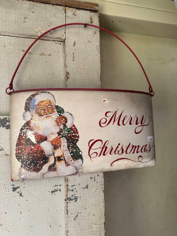 Vintage Merry Christmas tin wall hanging, fill with Christmas greens for a beautiful accent piece. 14" high, 14" wide